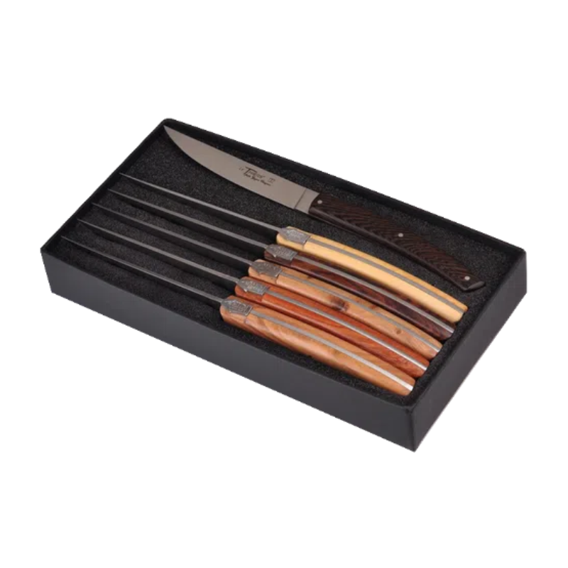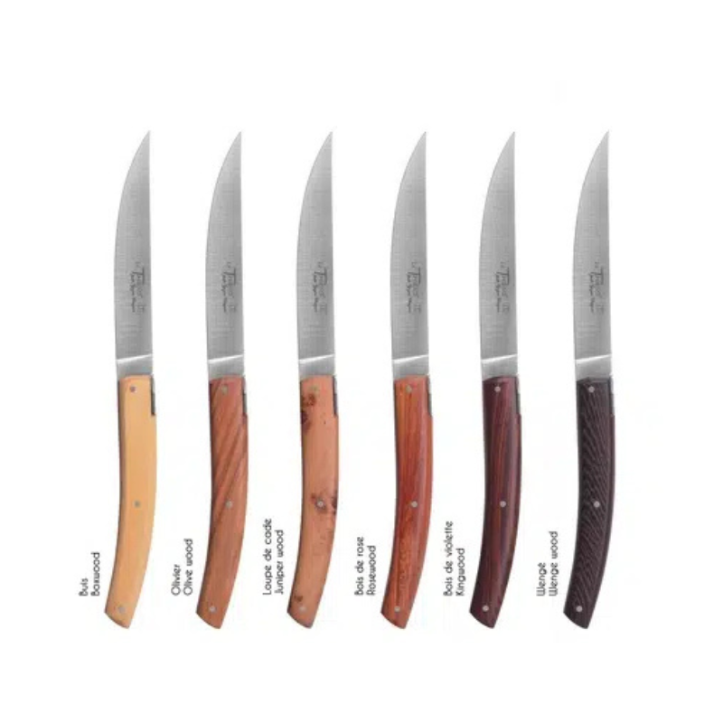 Les manches en bois véritable de buis, olivier, cade, bois de rose, bois de violette et wengé sont montés par trois rivets. Chacun apporte une teinte, un veinage et un toucher uniques, pour une table élégante et chaleureuse.