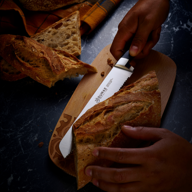 Le couteau à pain 20 cm est conçu pour trancher tous types de pains, qu’ils soient à croûte épaisse ou fine, sans écraser ni déchirer la mie. De plus, sa lame rigide, associée à une denture hybride exclusive (modèle déposé), garantit une accroche parfaite sur la croûte et une coupe nette et régulière.