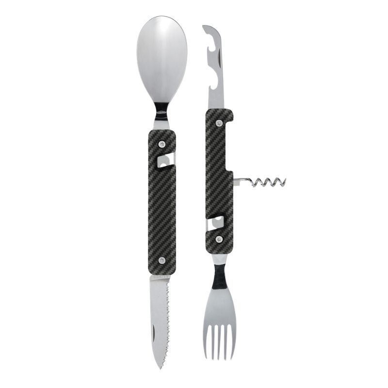 • Set complet : grande cuillère, fourchette 5 dents, couteau micro-denté, tire-bouchon, ouvre-boîte et décapsuleur